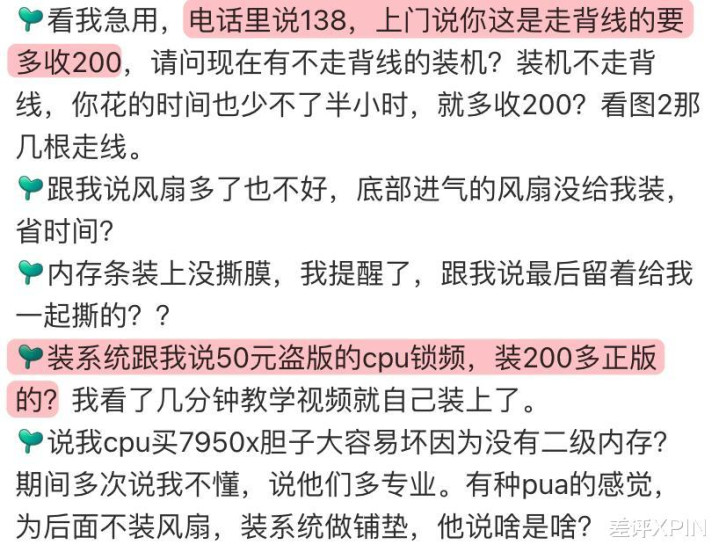还有网友在电话里说好 138 装机,上门就变成“走背线加 200”。