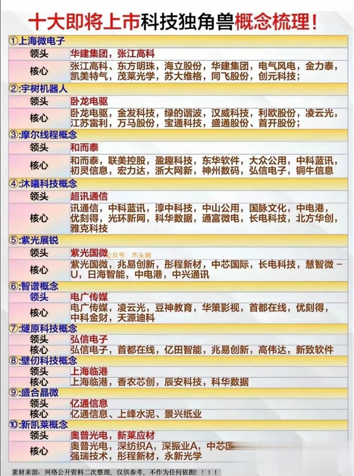 十大待上市科技独角兽概念梳理来了!除了上面介绍的摩尔线程和沐曦集成,还有宇树、盛合晶微、荣耀、超聚变等科技独角兽正在冲击上市,相关概念受益公司名单梳理!(注:信息仅供参考,不构成投资依据)。