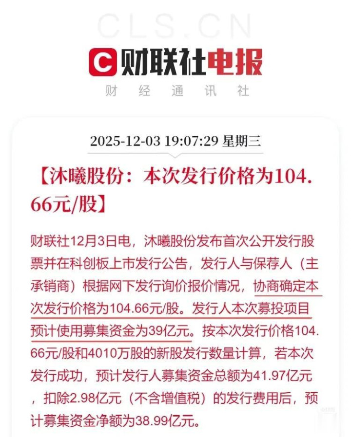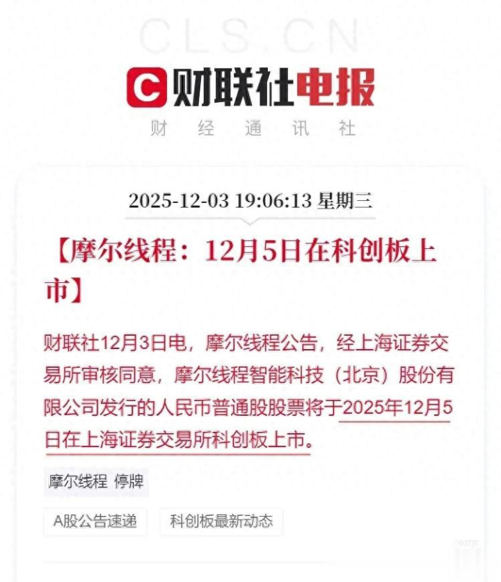 财联社最新消息,摩尔线程敲定12月5日科创板上市!这家AI芯片领域的企业,经上交所审核同意后,将正式登陆科创板。另外沐曦股份科创板发行价敲定104.66元/股。